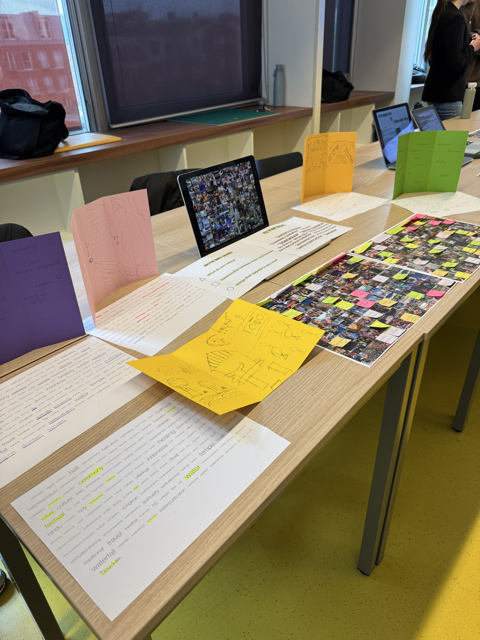 Na de noticing session, kun je de verkregen inzichten van de participanten verwerken en analyseren. Zo kun je bijvoorbeeld de diverse data naast elkaar leggen om te zien of er gelijkenissen zijn of grote verschillen. Ook kun je met collega’s of anderen praten over je uitkomsten in de vorm van een pitch, discussie of marktopstelling (zie de afbeelding hiernaast). Dit kan een interessant inzicht geven of een mogelijkheid voor een iteratie slag binnen je onderzoek.